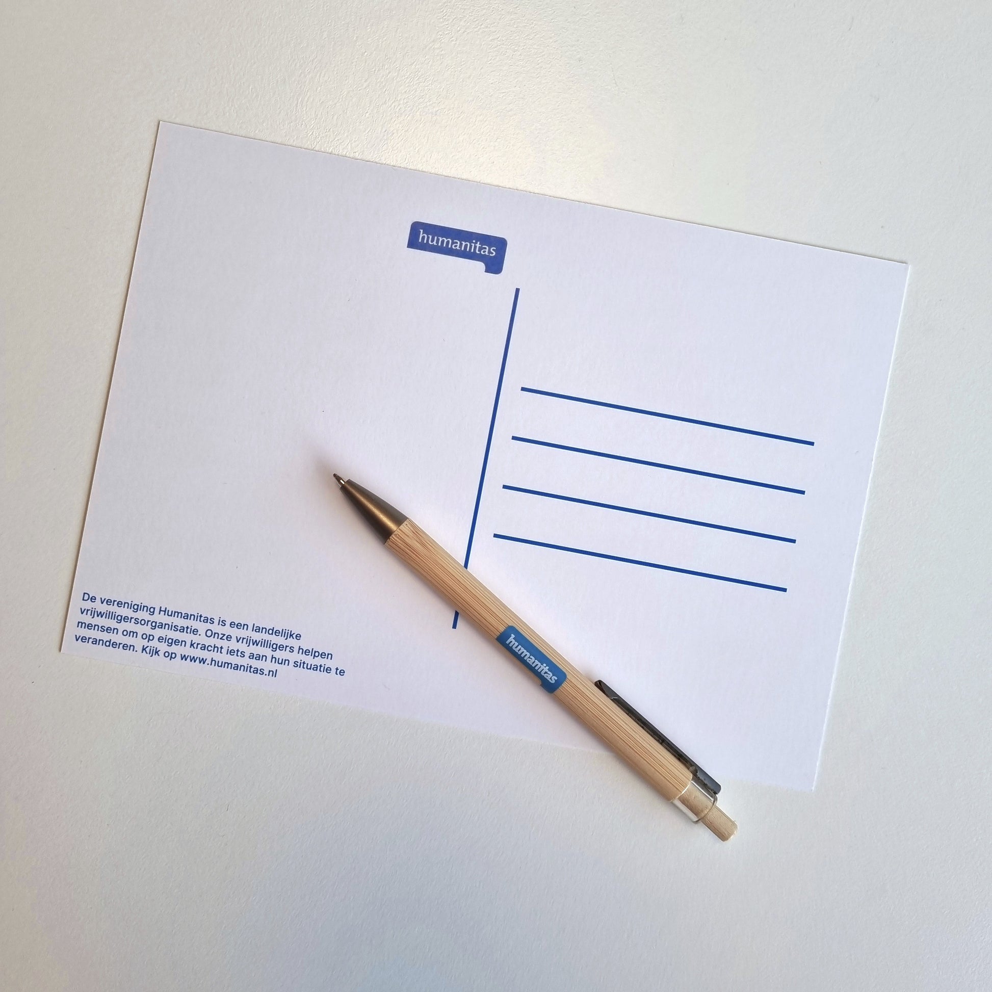 Op de achterzijde vind je het Humanitas-logo, een korte beschrijving van het waardevolle werk van onze vereniging, en voldoende ruimte voor een adres en je eigen boodschap. De kaart heeft een tijdloos ontwerp zonder jaartal, zodat je deze ook in toekomstige seizoenen kunt gebruiken.