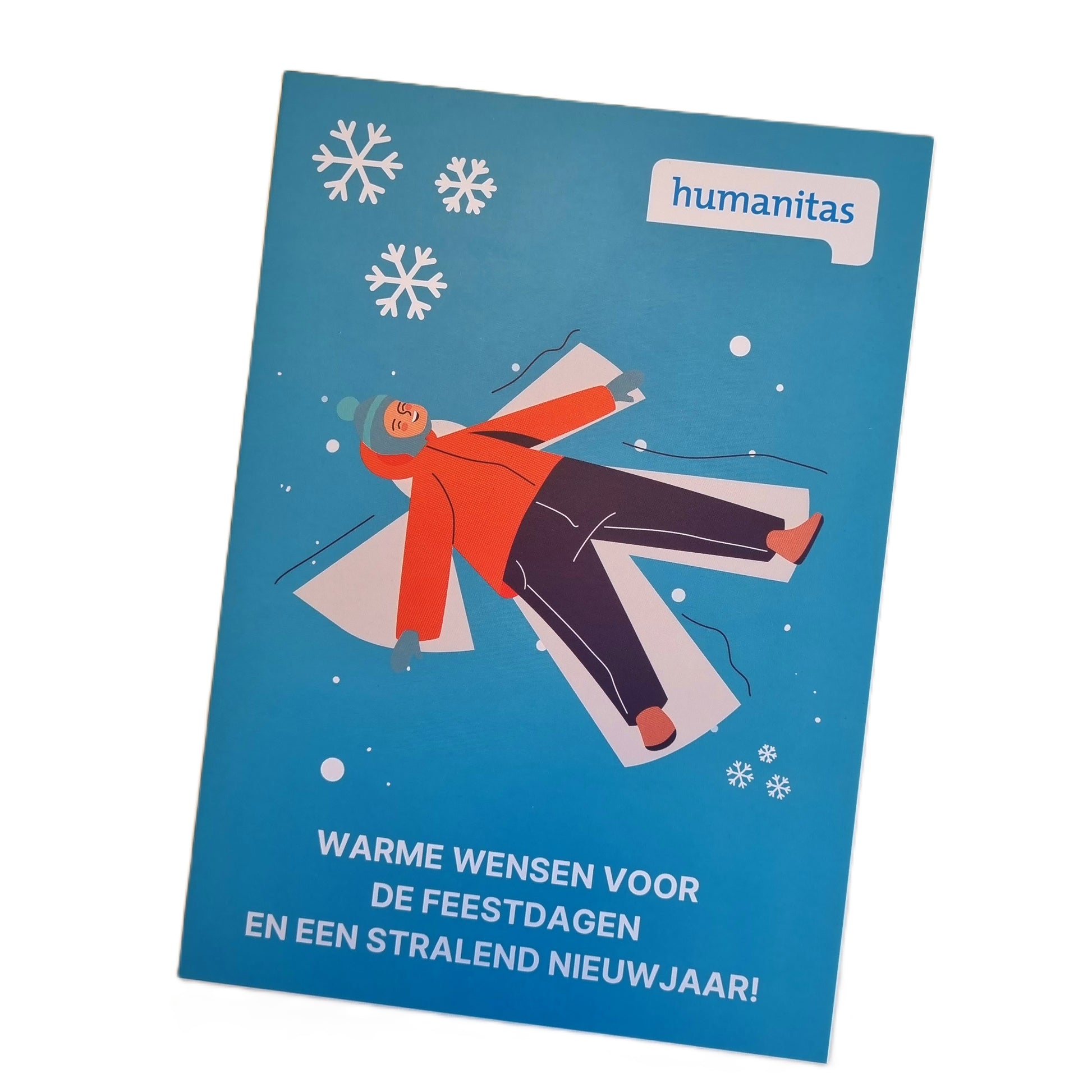 Op de achterzijde vind je het Humanitas-logo, een korte beschrijving van het waardevolle werk van onze vereniging, en voldoende ruimte voor een adres en je eigen boodschap. De kaart heeft een tijdloos ontwerp zonder jaartal, zodat je deze ook in toekomstige seizoenen kunt gebruiken.